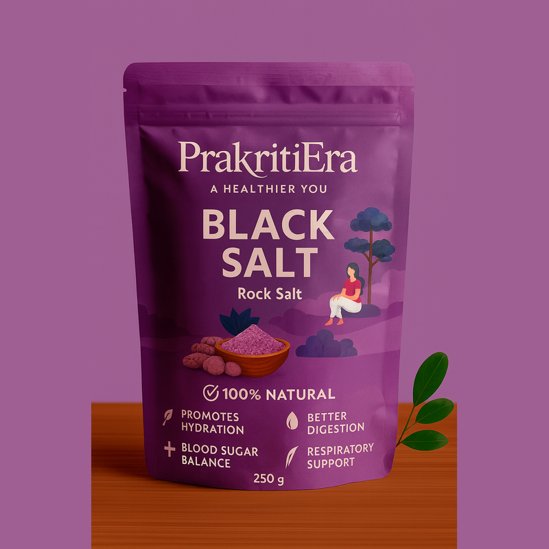 PrakritiEra Black Salt is 100% natural and sourced directly from mineral-rich stones. Carefully ground into fine powder, it retains its earthy taste and essential minerals. Known in Ayurveda for its digestive benefits, black salt is a healthier alternative to refined salt and adds a unique flavor to your meals.